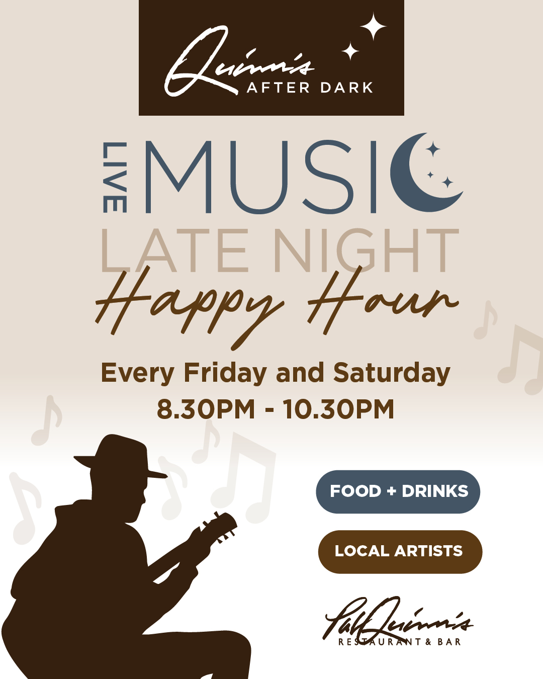 Join us every Friday & Saturday from 8:30pm - 10:30pm for Live Music and Late Night Happy Hour